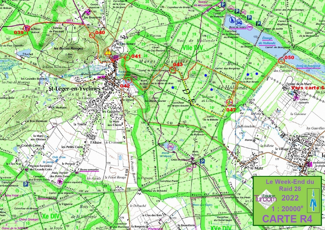 On quitte la balise par le sud histoire de contourner le chateau de Méridon (lieu connu des orienteurs) puis on rejoint le PC situé à la traversée de la route. Ce PC correspond à la seule barrière horaire de la course. On devait passer ici impérativement avant 12h30, et il est 10h45. On a 1h45 d'avance sur la barrière, et du coup il nous reste 4h15 pour faire les 15 derniers kilomètres