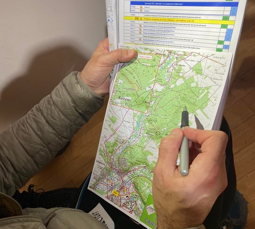 On récupère donc notre road book. On reporte en quelques minutes les balises de la première carte uniquement et on donne le Go du départ.