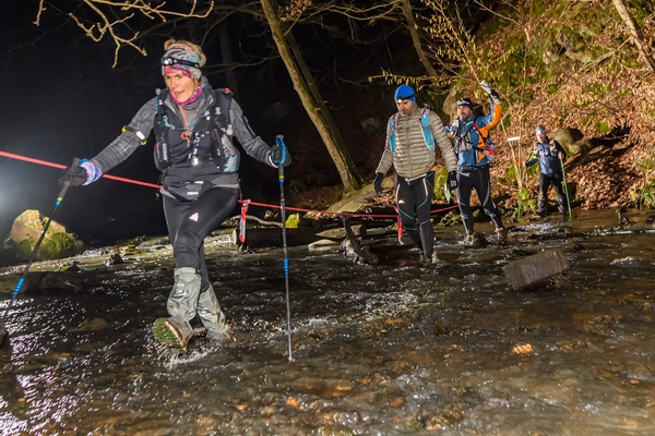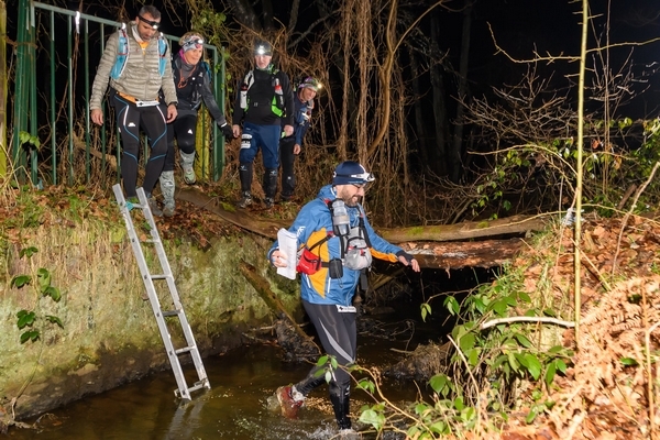 Allez hop ! On se lance dans la traversée sans réfléchir. Souvent des équipes enlèves les chaussures, les chaussettes, utilisent des sacs en plastique. Ca ne sert à rien. Ca fait des heures qu'on progresse dans la boue et que les pieds sont mouillés, donc le passage dans l'eau a un avantage, celui de nous permettre de laver les chaussures.