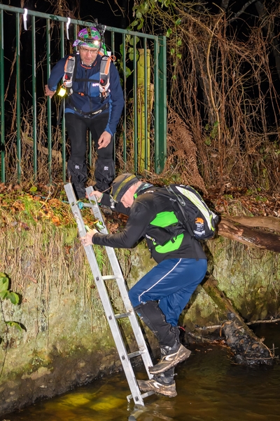En repartant de PP020 on fait un petit écart dans un bois pour traverser la Guesle. Eau step 1. Là c'est simple, une échelle pour descendre dans l'eau, on traverse et une autre échelle pour remonter de l'autre côté, de quoi tremper les pieds dans une eau à 3 degrés juste avant de passer au PC1.
