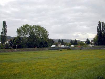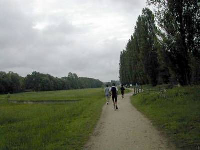 Le chemin large et confortable est bordé à droite par les grands peupliers poussant le long de la rivière où sont installée quelques habitations et à gauche par le talus qui, après le pont du déversoir, domine le bassin.
