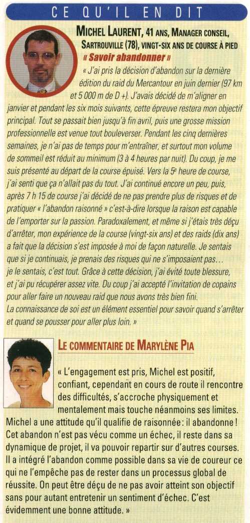 Mais pas question de baisser les bras. Les raisons de mon abandon me sont connues, la décision d’arrêter a été prise sans pression, et je suis persuadé aujourd’hui d’avoir fait le bon choix. Vous pouvez d’ailleurs lire l’article sur ce point qui est paru dans Jogging International de Novembre 2003