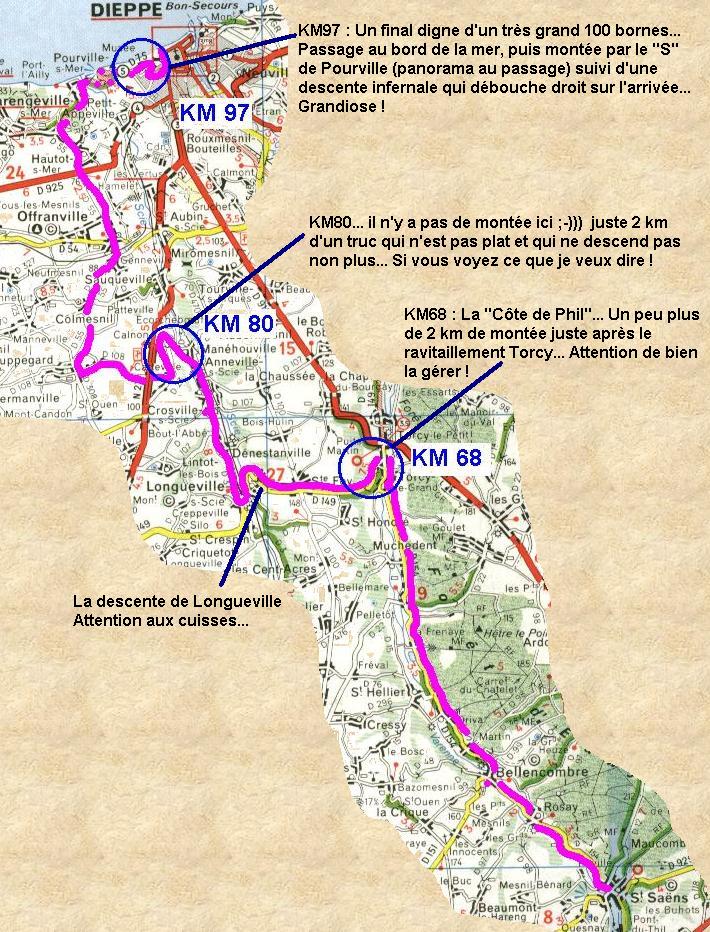 Lorsque les organisateurs du futur 100km de Normandie (qui verra le jour le 25 juin prochain) ont passé un appel pour venir tester une partie du circuit, j'ai hésité quelques instants. Ce n'est pas tant la distance en soi (environ 50km) qui me tracassait, mais surtout le fait que cela se déroule uniquement sur bitume… Pas bon, ni pour mes genoux, ni pour mes problèmes de crampes… Mais, un engagement de MMI (président du comité d'organisation, excusez du peu) à faire ça tranquille, doublé d'une proposition de kebab-bière-frites à l'arrivée et triplé de la présence d'une bande de lurons en tous genres ont eu raison de mes craintes... Quoi qu'il en soit, ce futur 100 bornes sera dans la lignée des Millau et autres Belvès eu égard aux quelques mouvement de terrain existant dans la campagne Normande ! Pour celles et ceux qui en ont l'envie, voici (en avant première) le tracé de cette seconde section des 100km. |
