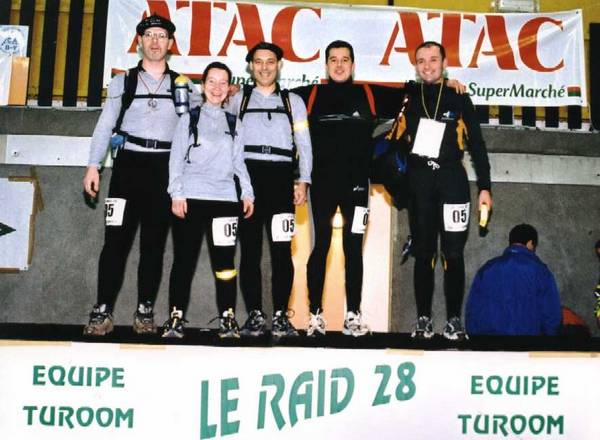 En 2001, alors que je venais de rejoindre la mailing list de la " ménagerie ", voilà que passe un message proposant de monter une ou deux équipes pour le Raid 28. Ayant tendance à me laisser facilement embarquer dans ce genre d’aventures, je me retrouve avec des coéquipiers géographiquement répartis (1 normand, 1 champenois, 1 savoyard et une belge) … La préparation se passe pas trop mal, mais surtout, il se passe quelque chose entre nous… nous ne nous connaissions qu’au travers d’internet, mais dès notre première rencontre, le courant est passé.. (et il ne s’est pas arrêté depuis).