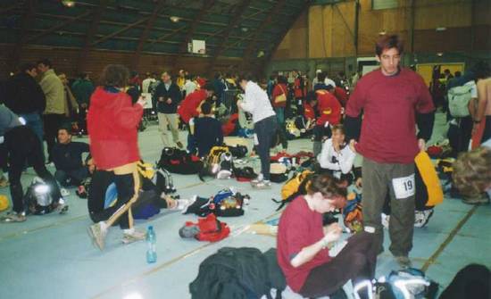 Le hall de ce gymnase, je le reconnais… c’est celui qui servait de point limite (ou que l’on pensait servir de point limite) il y a deux ans pour l’activité Canoë… Et mieux que ca… en discutant , la bénévole me dit que cette année ils ont interdit l’accès aux accompagnateurs car il y a deux ans, le hall était plein d'accompagnateurs et les coureurs ne pouvaient pas rentrer, y compris ceux qui voulaient voir le médecin (est-ce que eul’toutou se souvient de ça ;-)))).