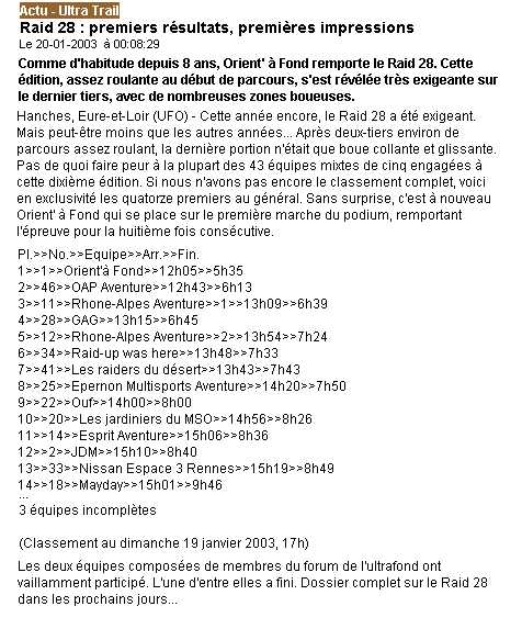 En complément de ces CR, un dossier complet sur le Raid 28 a été réalisé sur le site www.ultrafondus.fr. Ultrafondus Page 1 La présentation avant la course Ultrafondus Page 2 Les premiers résultats Ultrafondus Page 3 L’introduction du dossier complet |