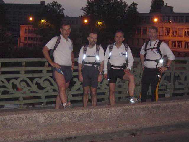 Et c’est reparti. C’est quand même super sympa Paris la nuit… On remonte le canal, puis Stalingrad, puis direction La Villette. Au passage on se fait doubler par une sorte de Kenyan, en tenue de ville et visiblement plus pressé que nous de rentrer chez lui ! L’allure est plutôt cool, et on avance pas mal (je trouve). Passé La Villette, on continue le canal en direction de St Denis. Là c’est assez étrange. Bon, certes les quais sont en cours de réhabilitation (ca devrait être sympa une fois terminé) mais je me dis parfois que je suis bien content qu’on soit 5 à traîner dans le coin ! Enzo qui connaît tout ce quartier est super à l’aise… Et c’est vrai que finalement, tout se passera très bien. Ufoot nous dirige d’une main de maître, pas d’erreur, on sent qu’il a sacrément préparé son coup l’animal. Passage à proximité du Stade de France, mais personne ne veut faire le détours pour le voir de plus près :-((( Tant pis ! On termine la traversée de St Denis, puis on entre sur l’Ile Saint-Denis que nous allons remonter sur un long morceau. En temps normal, il y a un grand parc dans lequel on peut courir, mais là il est encore trop tôt et il est fermé. On trottine donc sur la route, et il faut bien admettre que c’est vachement calme. Seul l’abus de bitume commence à peser un peu sur ma rotule grinçante, mais bon ça devrait bien tenir encore un peu ! Fin de l’île. On repasse sur la rive, puis on se dirige vers Enghien. Ah ! Enghien, son lac, son casino, sa riviera… (si si… ca existe). Petite photo au bord de l’eau. Une en courant (floue) une autre à l’arrêt (plus nette).