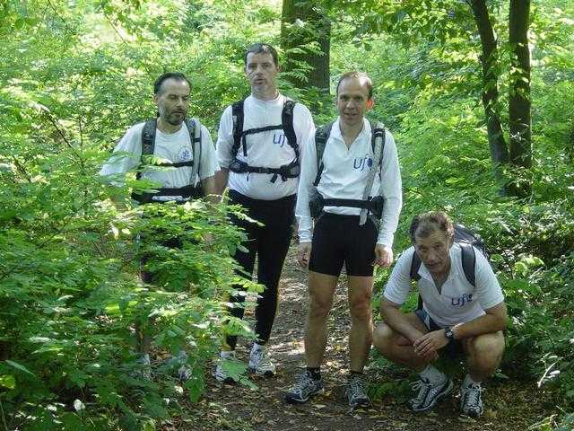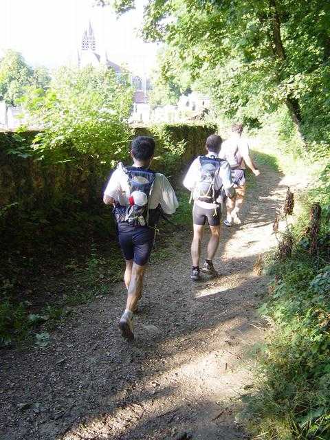 Je commence à avoir du mal à rester caler sur l’allure du groupe, mais les nombreuses pauses de mes camarades me permettent de revenir sur le groupe ;-)) En approchant de la sortie de la foret, Ufoot nous indique qu’on devrait trouver un point d’eau dans un cimetières. Vu l’heure, il doit être ouvert !