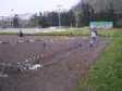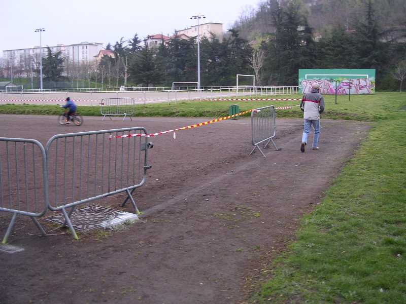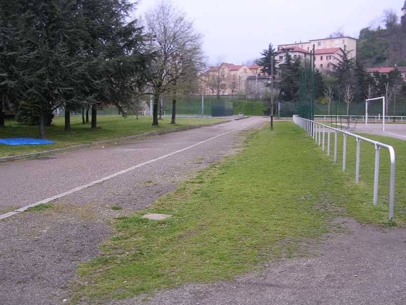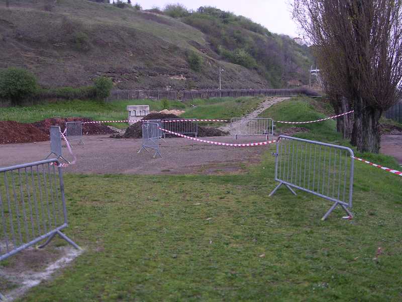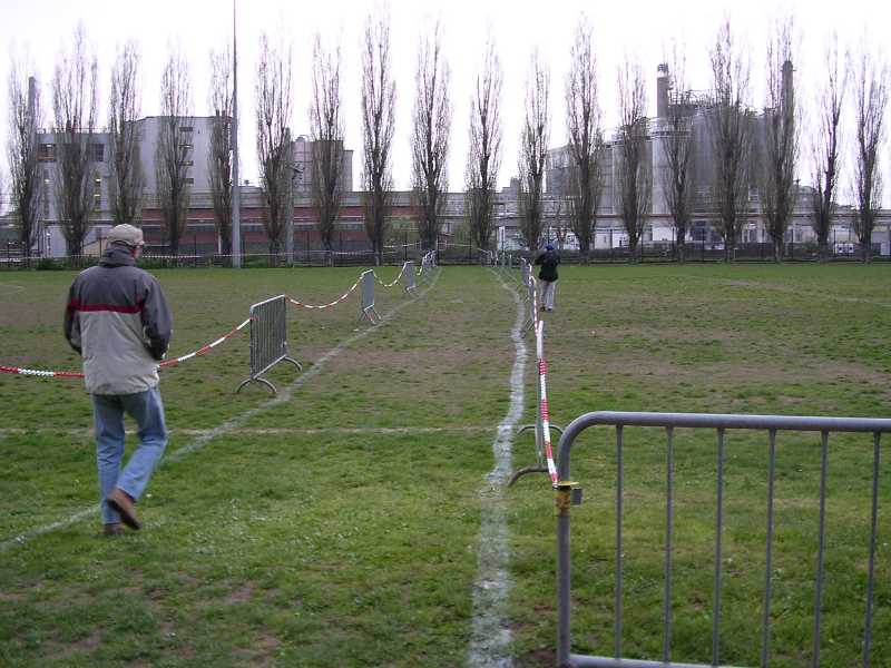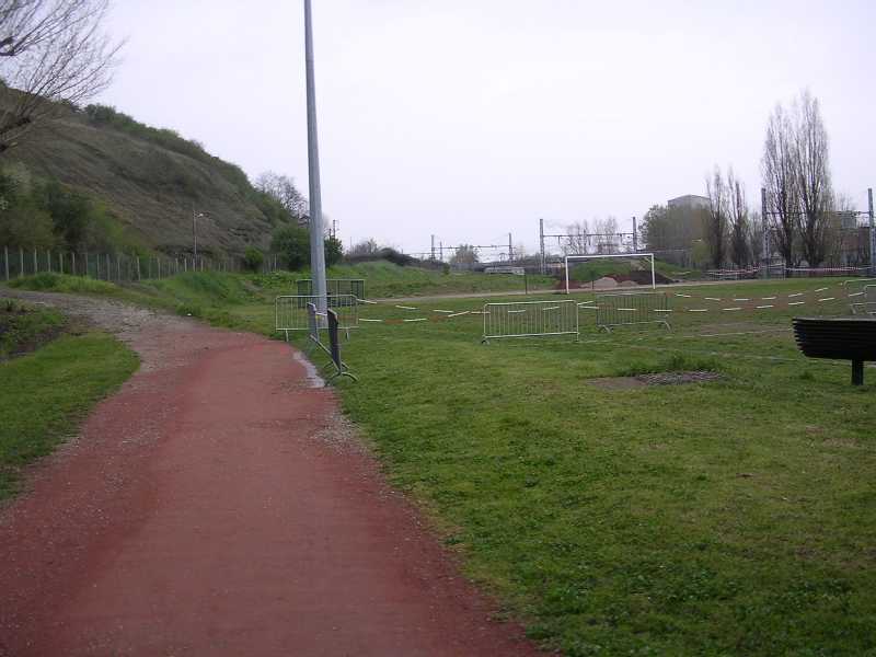 Arrivé aux barrières, on tourne à droite. Petite descente sur 2 mètres puis on traverse le terrain de foot |