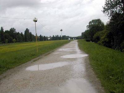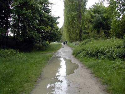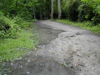 Sur cette section du chemin, les grandes mares d'eau qui se forment à la première pluie sont difficiles à éviter quand on arrive sur les lieux en même temps que des promeneurs.