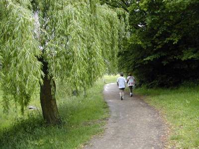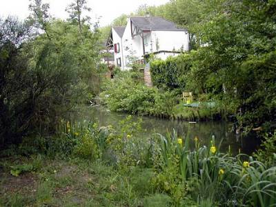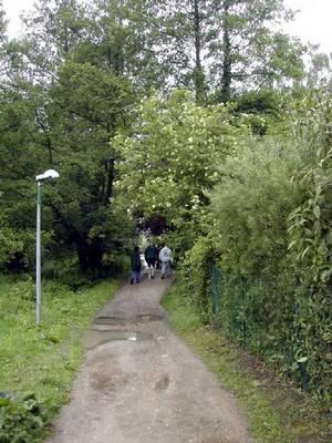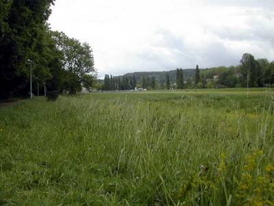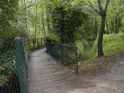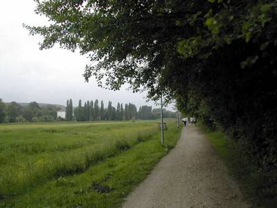 Le chemin large et confortable est bordé à droite par les grands peupliers poussant le long de la rivière où sont installée quelques habitations et à gauche par le talus qui, après le pont du déversoir, domine le bassin.