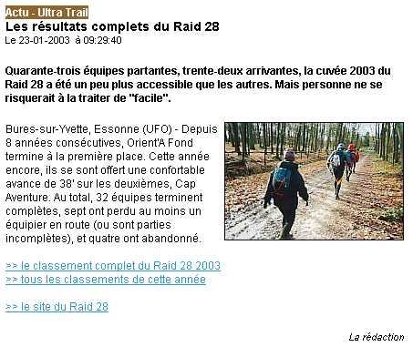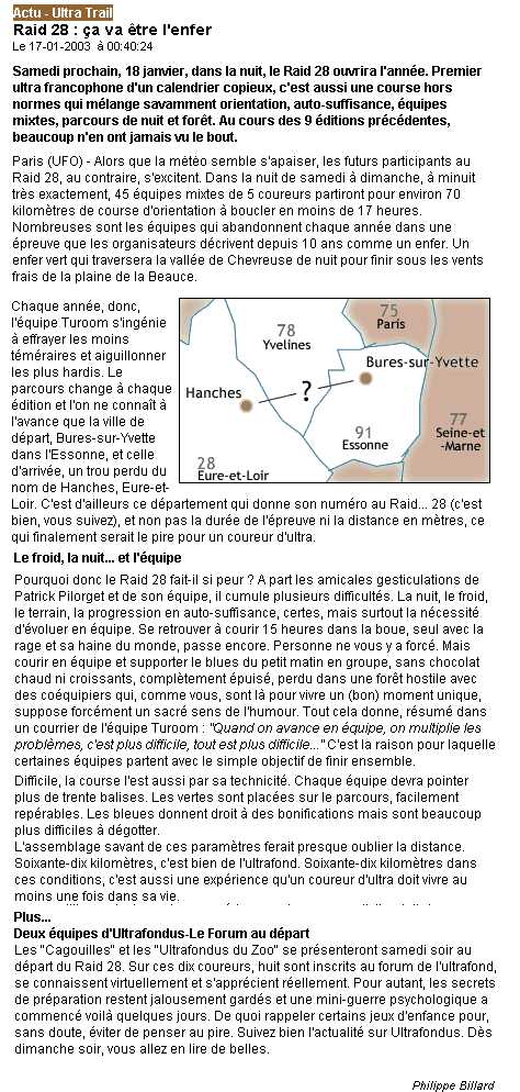 En complément de ces CR, un dossier complet sur le Raid 28 a été réalisé sur le site www.ultrafondus.fr. Ultrafondus Page 1 La présentation avant la course Ultrafondus Page 2 Les premiers résultats Ultrafondus Page 3 L’introduction du dossier complet |
