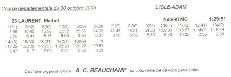 Reprise en douceur de l'orientation lors de cette épreuve organisée par mon club ( AC Beauchamp CO)Je n'avais pas prévu de courir au début, puis une fois l'organisation de la course mise en place, je me suis dit qu'un petit circuit ne me ferait pas de mal. En fait, je vais accompagner un petit nouveau qui débutait) pendant les 7 premiers postes. L'allure sera donc assez tranquille et surtout entrecoupée de pas mal d'explications. Ensuite, je vais faire les 11 derniers postes tout seul. Vous pouvez retrouver la définition des postes, la carte, ainsi que mon résultat, même si du coup celui-ci n'est pas réellement représentatif (en gros c'est presque le même temps pour les 7 premiers postes que pour les 11 derniers ;-) |