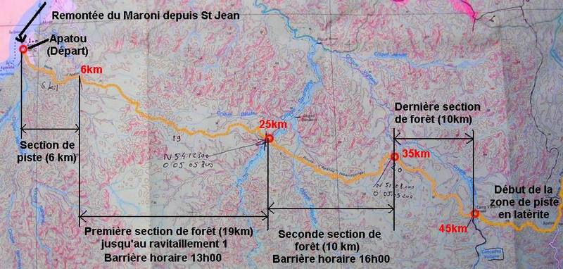 - 80km de piste en latérite + bitume jusqu'à l'arrivée à St Laurent du Maroni (avec ravitaillement au km70, km90 et km110)