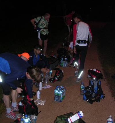 Les choix suivant les concurrents divergent. Certains consomment un plat tout de suite histoire d'en porter le moins possible, d'autres mettent la ration telle quelle dans le sac. Pour ma part j'opte pour une position intermédiaire. Pas envie de manger un plat chaud maintenant (il est environ 11h30 et on est en course depuis seulement 4h30). Je vais donc me ravitailler avec les petits éléments contenus dans la ration, et emporter dans mon sac une seule barquette pour la manger vers le km70. J'emporte aussi les gourmandises légères (pâte de fruit et nougat). Pour le reste je ferai avec mon stock perso. Côté eau, je rempli la poche à eau, le bidon de secours et je met dans le sac une bouteille de 1,5 L en plus pour être certain de ne pas me faire piéger d'ici le prochain ravitaillement au km45.