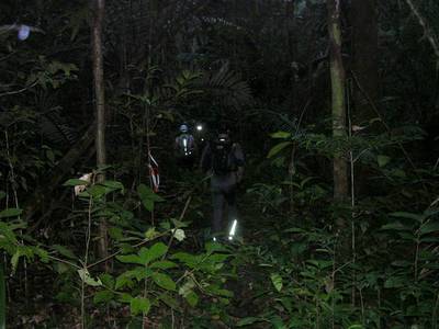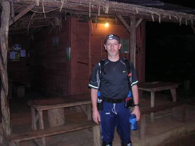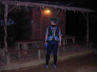 C'est donc en configuration très légère que je me lance sur ces 80km de piste. Le début est plutôt vallonné. Je monte en marchant et je descend en courant. Je vais conserver ce rythme tant que la lumière du jour va me le permettre, profitant ensuite de la tombée de la nuit pour découvrir quelques jolies lucioles aux capacités lumineuses impressionnantes. Les 25km qui séparent l'auberge Voltaire du camp Maïpouri deviennent progressivement interminables. Avec la nuit, la marche à remplacé la course, et même la présence de Samuel que j'ai rattrapé et qui s'ennuyait ferme tout seul ne fait pas passer les kilomètres beaucoup plus vite.