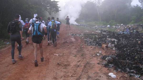 7h00 - Je me lance avec les concurrent du premier départ. Le jour est levé mais la brume matinale est bien présente comme tous les matins (chaleur + humidité). C'est parti pour 6km de piste en latérite afin de rejoindre la première section forestière.