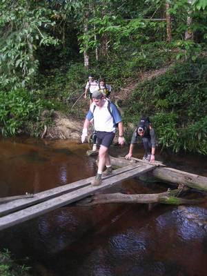 L'entrée dans la forêt est marquée par la traversée d'une crique (une crique en Guyane étant un cours d'eau) sur un pont de fortune mêlant tronc d'arbre et planches. A partir de maintenant on est dans la forêt amazonienne... enfin !