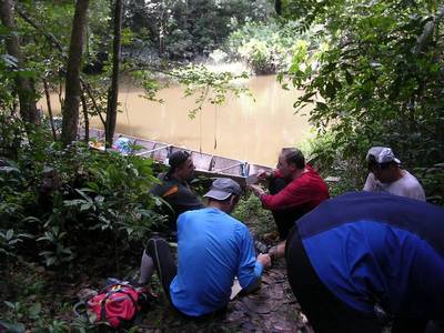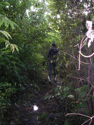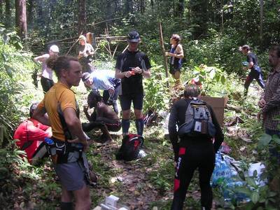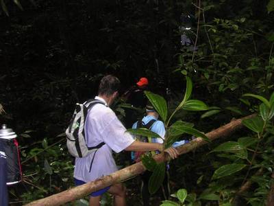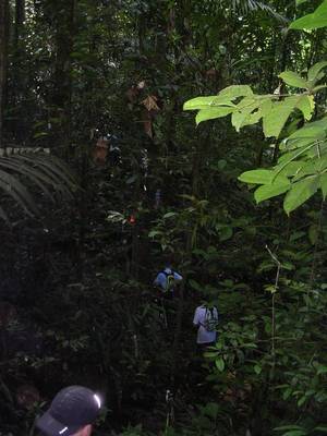 La progression n'est finalement pas si difficile que ça. Bien sur le fort taux d'humidité déclenche une sudation très importante, mais la température sous la canopée (couverture végétale assez dense située à environ 40m au dessus du sol et faisant comme une sorte de toit) reste tout à fait agréable (autour des 25°), mais il ne faut pas trop chercher à voir le soleil.