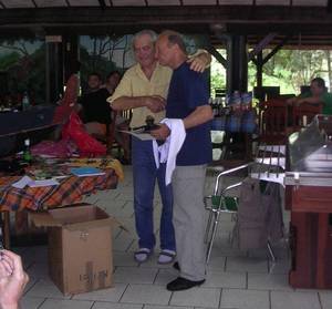 L'après midi du samedi et la matinée du Dimanche sont utilisés pour remettre d'aplomb les coureurs… au programme repos, douche, piscine… puis en fin de matinée Alain procède à la remise des prix… Ce sera , outre le traditionnel TS, soit une machette (une vraie de vraie…) soit un paréo…