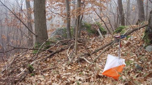 L’attaque du poste est plus intéressante. Plusieurs sentiers rentrent dans le D+ et il faut choisir le bon. Je trouve celui que je pense être le meilleur je le suis un peu puis je prends dans la courbe de niveau histoire de remonter progressivement vers l’avancée depuis le bas (et pas depuis l’est). En effet on ne sait pas exactement à quel niveau de l’avancée se situe la balise, alors autant ne pas tout monter pour rien. Ce choix me portera directement dessus sans problème