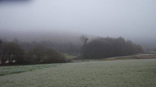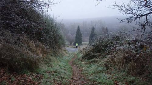 Sortie de poste droit au sud pour trouver le large chemin. Ensuite difficile de se perdre d’autant qu’il y a une traversée de route imposée. Première route traversée à mi-parcours, quelques maisons et c’est reparti pour un second champ. C’est plat, c’est tout droit, Il fait froid (ça gèle) et en plus on a un peu de vent. Des conditions qui me rappellent le raid28 dans la Beauce. Au bout du champ on attaque une longue descente dans un sentier très encaissé. Ca n’en fini pas et à un moment je décroche (encore) de la carte… Je m’arrête pris d’un doute jusqu’à ce que je sois rejoint par deux membre de l’extrem team qui me font repartir… décidément j’ai du mal aujourd’hui. On continue jusqu’à la seconde traversée de route ou Domi officie. Petite photo, salut, et hop ça repart… C’est pas tout mais j’ai des balises à aller chercher moi et vu comment ça a commencé, je suis pas rentré
