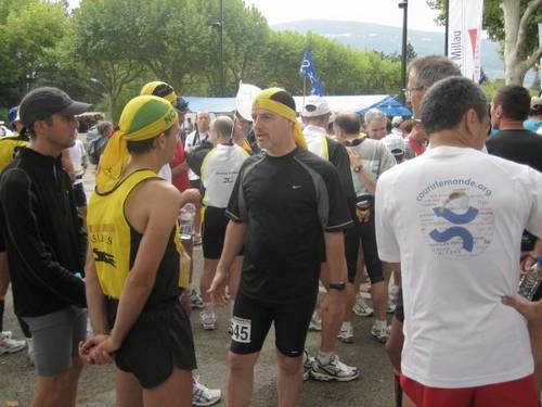" Une valse à 4 temps,qui s’offre encore le temps, qui s’offre encore le temps, de s’offrir des détours, du côté de Millau, comme c’est charmant… " La valse à 4 temps, c’est un peu ce à quoi va ressembler ce 100 bornes pour moi, mais avec une différence important par rapport à la valse du grand Jacques, c’est que la mienne va aller de plus en plus lentement au fil des temps… La journée du Vendredi est dévolue au trajet Paris-Millau en compagnie de Boucanier, Philippe (rencontré sur le forum de Millau) et du couple Rodio. L’avantage d’avoir un ensemble Michel-Rodio dans la voiture est qu’il n’est pas utile d’allumer l’autoradio ! Arrivée sur Millau en fin d’après midi, je prend mes quartiers dans l’hôtel que j’avais pris soin de réserver depuis Avril dernier, et situé en plein centre ville à quelques hectomètres du départ (et de l’arrivée !). Passage au parc des victoires pour retirer le dossard et profiter de l’occasion pour retrouver quelques connaissances, puis un petit dîner de bonne heure dans une pizzeria du centre ville même pas surchargée en compagnie de coureurs helvétiques incluant une dégustation de la Pizza " spéciale 100km " à savoir une Pizza… aux pâtes ! (bon il y avait aussi de la crème, des lardons, de l’œuf…). Retour à l’hôtel sur les coups de 21h. là je passe une petite heure à tout préparer. Je veux avoir l’esprit tranquille demain matin. La tenue de départ est mise de côté, le sac que je vais laisser à l’arrivée et que je pourrai utiliser à la fin du marathon est également prêt. Je me couche vers 22h30, tranquillement et je passe une super nuit de sommeil jusqu’à 7h30, heure à laquelle je descend prendre un petit déjeuner plutôt classique (croissant, pain, beurre…) Le départ étant à 10 heures, j’ai largement le temps de remonter me préparer. Une douche, j’enfile la tenue prévue pour la première boucle, je me repose un peu et direction le parc des victoires. Arrivé sur place c’est un peu le bazar. Y’a du monde dans tous les coins et il n’est pas possible de faire 50m sans tomber sur une connaissance. Il faut dire que Millau c’est la grosse fête de l’ultra sur route…