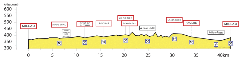 A 30mn du départ, … je suis bien… juste bien. Pas au top mais tous les voyants sont au vert. Coté préparation , je sais que mon " trou " de 6 semaines en pleine période de charge va certainement peser lourd, mais ce n’est pas encore perceptible.Côté physique , je suis bien reposé, je n’ai ni douleur, ni blessure… Il faudra que ça dure pendant quelques heures encore, mais en tous cas je démarrerai ce 100 bornes sans excuse préfabriquée en cas d’échec !Côté équipement , j’ai donné dans le light. Millau est une course avec une logistique assez importante. Je n’ai pas d’accompagnateur en vélo (était-ce une erreur ?) mais comme j’avais prévu de faire ça de façon autonome, tout est géré.21 ravitaillements sur le circuit… La réputation d’être biens fournis… Je décide donc de faire la première boucle (42,2km) sans rien emporter, et pour la seconde boucle je prendrai juste mon porte bidon car il y a plusieurs sections un peu longues sans ravito (6-7 km) et si il fait chaud avec l’allure qui se ralentira, il peut être utile d’avoir un peu d’eau avec soi.