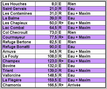 J’ai découpé cette stratégie en deux phases. Avant et après Courmayeur. Je sais que sur le début de course ça risque d’être un peu chargé aux ravitaillements, aussi j’emporte du solide (sandwich) dans mon sac pour compenser en cas de nécessité, mais l’expérience de l’an dernier aurait plutôt tendance à me rassurer sur la capacité de l’organisation à gérer ce trafic important. Après Courmayeur ça devrait être plus accessible et là je ne m’appuierai que sur les ravitaillements officiels.