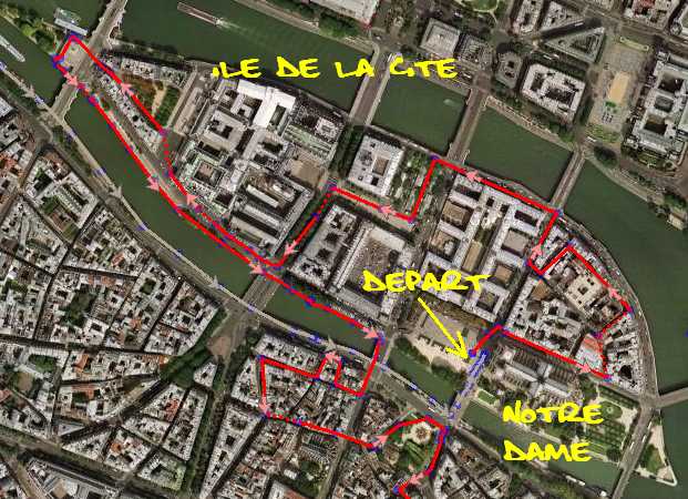 6h15 . Après avoir calé les GPS, nous voilà parti pour la première section de la visite.On commence par un échauffement sur l’île de la cité. ( voir la carte n°1)