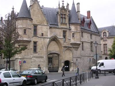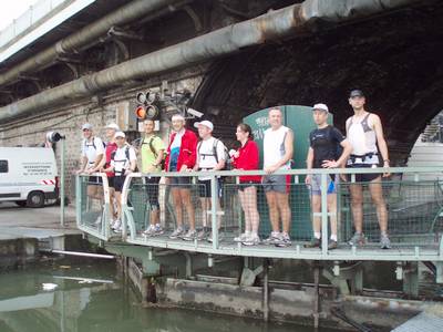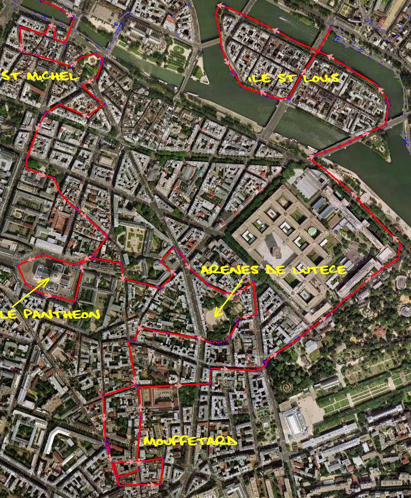 Passage au 36 quai des orfèvres puis descente sur les quais pour mettre les pieds dans l’eau… Maintenant que les chaussures sont mouillées, personne ne pensera plus à se plaindre de la pluie. Rapidement, le " Petit pont " va nous permettre d’entrer dans Saint Michel, ( voir la carte n°2) et d’entrer dans le vif du sujet avec la rue du " chat qui pêche " qui est la plus petite rue de Paris…On enchaîne les rues pavées du quartier et on remontre tranquillement faire le tour du Panthéon, bien calme à cette heure là. Peu de gens savent que Paris dispose de ses Arènes. Elles ne rivalisent pas avec le Colisée, mais ce lieu magique, niché derrière un parc en bordure de la rue Monge reste cependant un lieu agréable. Seuls les horaires d’ouverture des Parcs et Jardins vont nous empêcher d’y pénétrer. Tant pis !. On monte Place de la Contrescarpe pour une promenade autour de la rue Mouffetard. Depuis le départ, Jean-Claude, également grand amateur de Paris et d’histoire, nous indique des points particuliers, nous arrêtant pour voir un morceau de l’ancienne muraille qui encerclait Paris autrefois ou une tour de l’ancienne Bastille. Soyons honnête, ce sera aussi notre meilleur guide concernant les pâtisseries et les salons de thé nous indiquant, rue par rue, le lieu où il faut aller prendre un chocolat ou boire le thé (du verbe boirleuter… Je boirleute, tu boirleutes, il boirleute, nous boirleutons, vous boirleutez…). Arrivé Place Herr, première demande de pose technique de la part de nos féminines. Pas de chance les sanisettes sont HS et elles n’ont pas envie de faire entre deux voitures. Qu’à cela ne tienne ! On est devant un commissariat (la Brigade Centrale des Accidents) et après une très courte négociation, on leur obtient le droit d’utiliser les toilettes du commissariat… Qui a dit que les Condés d’Paname n’étaient pas serviables ? Quelques ruelles pour finir le quartier, retour vers l’île Sait Louis dont on va faire presque le tour par les quais avant de passer sur la rive droite.