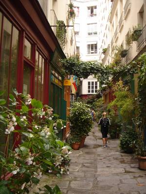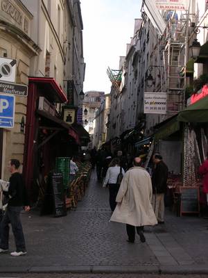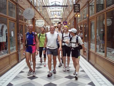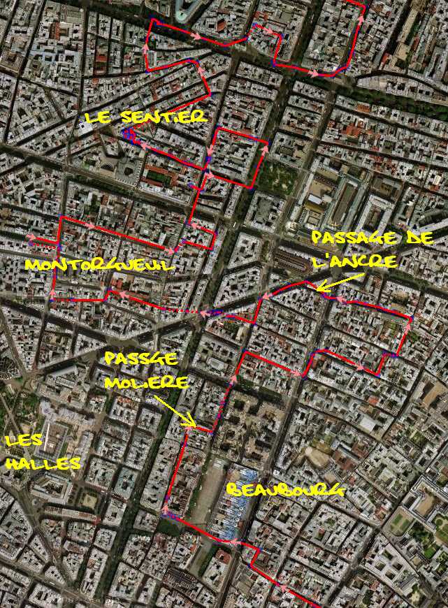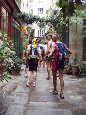 où une des plus anciennes maisons de Paris (les historiens ne sont pas tous d’accord) à l’angle de la Rue Cloche Perce. Régulièrement j’ausculte le groupe pour voir si tout se passe bien. Marc m’a demandé quelques jours avant la course si sa fille, Anne, pouvait venir nous accompagner une heure ou deux. Elle ne coure pas beaucoup, et sa compétition la plus longue reste la Parisienne avec ses 6km (oui, oui, vous avez bien lu !). C’est là aussi un des atouts de cette sortie. Dans Paris il est toujours possible de couper ou de stopper. On est jamais loin d’une station de métro (moins de 400m de n’importe quel point de la capitale). Pour le moment elle tient bon, et notre rythme peu soutenu ponctué de pauses fréquentes lui permet de rester dans le groupe. Les petits bouts de quartier s’enchaînes… ( voir la carte n°4) Beaubourg avec le superbe passage Molière, Art et Métiers avec le passage des Gravilliers, puis le quartier commerçant de la Rue Montorgueil où le marché est en train de se mettre en place. D’ici une heure la rue ne sera probablement plus traversable !D’ailleurs pour y arriver nous allons traverser le passage de l’ancre, étroit et fleuri, qui ne se découvre qu’après avoir poussé une porte cochère … Si on ne sait pas qu’il est là, on peut toujours le chercher