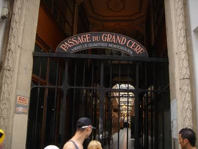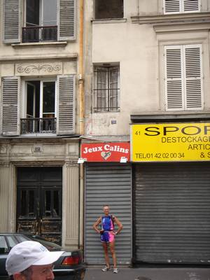 Le parcours privilégie les passages dans les galeries, et si la semaine elles sont toutes ouvertes, il n’en est pas toujours de même le WE. On traverse ainsi le passage Bourg L’Abbé, et en quittant le passage on passe devant un troquet où les quelques personnes au comptoir nous gratifie d’un " allez les marathoniens "… Un petit signe de la main, on traverse la rue pour prendre le passage du Grand Cerf et là … Pas de chance, la grille est fermée. J’appuie sur le bouton d’ouverture (au cas où !) mais rien à faire. Tant pis on va faire le tour. A ce moment là une voix nous appelle par derrière " Attendez, je vais vous ouvrir ! " Une des clientes du troquet n’est autre que la concierge de la galerie. Elle vient juste de finir de la laver (ça fait quand même plus de 100m de long) mais nous propose de nous le faire traverser quand même… Après la maréchaussée, ce sont les concierges parisiens qui nous deviennent sympathiques ! Le passage vers la mairie du Xème ( voir la carte n° 5) sera aussi l’occasion pour Jean-Paul de poser devant la plus petite maison de Paris (moins de 2m de large). En fait on se demande si il a posé là en raison de la maison ou à cause de l’enseigne " coquine " qu’elle abrite ! |