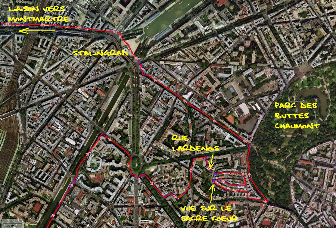 puis direction la place du Colonel Fabien pour arriver rue Georges Lardenois (voir la carte n° 6) . Petite montée pour chauffer les cuisses et on se retrouve dans un petit village de 4 rues, avec des maisons de ville et surtout un point de vue sur le Sacré-Cœur