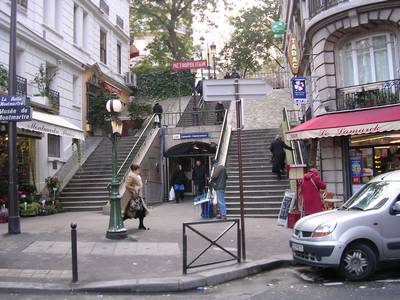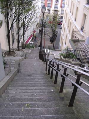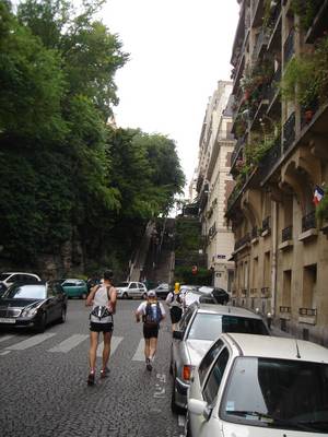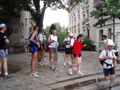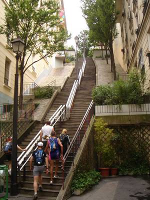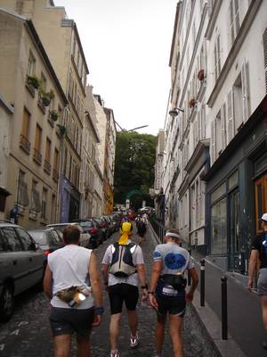 On monte par le coté Est de la Butte jusqu’au pied du Sacré cœur. Là on laisse Jean-Paul, Valérie et Christian faire une petite descente et remontée juste pour le plaisir, puis on se lance dans une visite du côté nord de la butte. Les rues pavées succèdent aux escaliers… Passage devant la station de métro Lamark Caulaincourt,