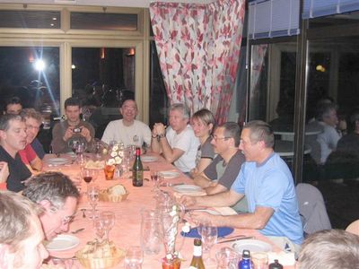 Ensuite direction l’hôtel à 4km de là. Un petit refuge qui ouvre ses portes spécialement pour la course ce WE là. On se retrouve avec les membres du Zoo car on est tous hébergés sur place et dans la soirée notre tablée va s’enrichir de la présence de membres de différents forum. Zoo, Ufo, ADDm, Kikourou ou X’trem team, c’est une tablée de 16 joyeuses et joyeux drilles qui va se restaurer au cours d’une soirée studieuse (mppffffffffff …) à laquelle vont s’inviter quelques vins d'Auvergne (aïe ma tête) du St nectaire fermier ou l’authentique " gourdasse bleue " apportée par son créateur originel… j’ai cité : Eul T’outou…
