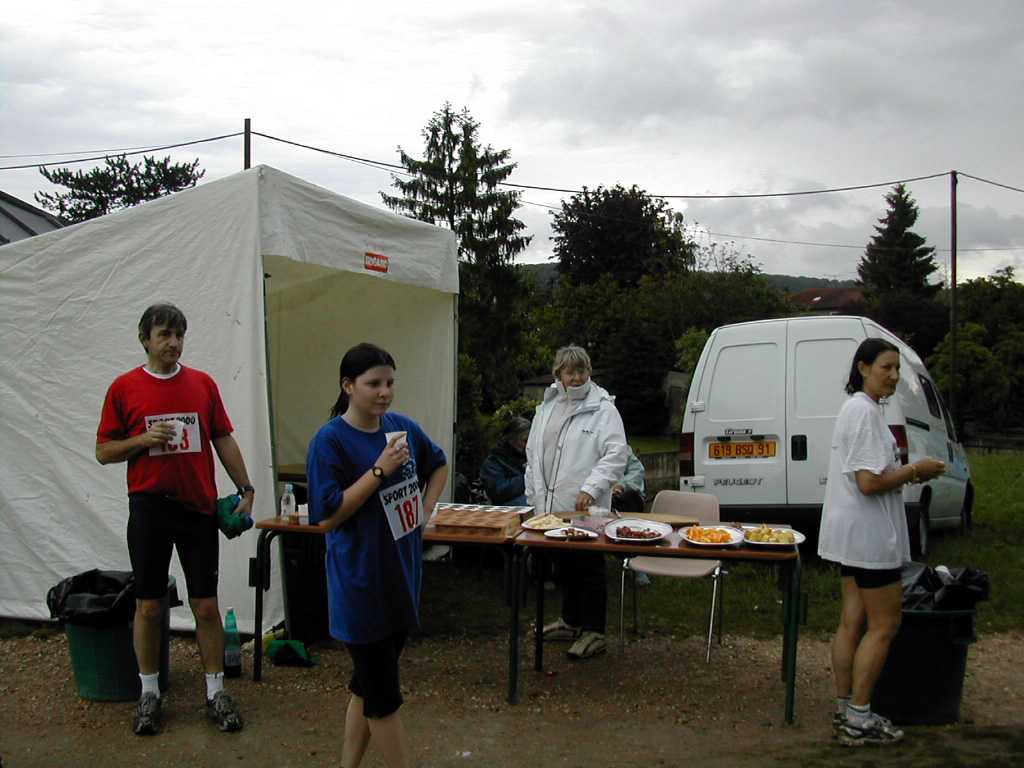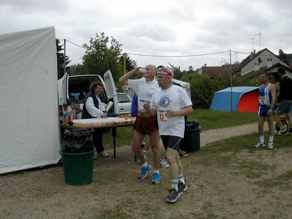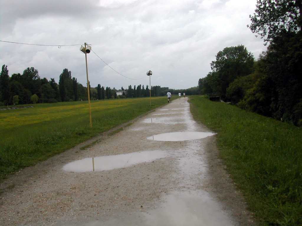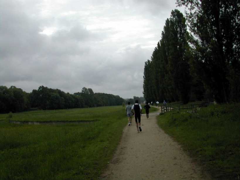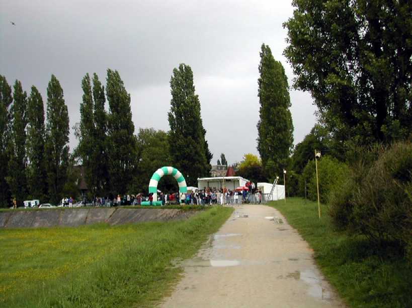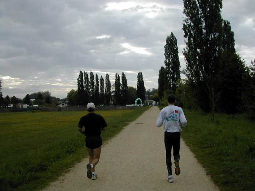 Un virage à angle droit à droite suivi de la " descente " du circuit (au moins 8 m de long), un tournant en épingle qui ramène au bord du bassin, puis un nouveau tournant pour revenir dans l'axe du bassin. C'est le seul endroit du circuit où l'on peut se sentir aller vite. Mais, attention à la chute ! Notre grande Monique s'y est abîmée l'épaule. Le tournant de l'épingle, souvent traversé par un ruisseau, est boueux. Les quelques cailloux du chemin annoncent ceux qui suivent. Le chemin le long du bois Le chemin longe le bois avant de s'y enfoncer. Le passage libre est étroit en raison des basses branches qui occupent largement le côté droit du chemin. Des cailloux dépassent du sable dur pour faire trébucher les coureurs épuisés. Plein de monde à pied ou à vélo affectionnent l'endroit. Il est donc difficile à franchir. De plus, de tout le circuit, c'est là que le vent d'ouest souffle le plus fort dans le nez des coureurs. On s'autorise juste un coup d'œil de l'autre coté du bassin pour essayer d'y deviner la progression des amis.La côte La "côte", (au moins 6 m de long et 2 m de dénivelé) est à l'entrée du bois. Il faut la respecter. Pendant les premières heures, les brutes dont j'étais aussi il y a quelques années, franchissent l'obstacle sans ralentir. Mais la "côte" a la rancune tenace. Elle use peu à peu pour obliger les irrespectueux du matin à marcher l'après-midi. L'obstacle franchi, on entre dans la forêt sombre. Il y fait toujours froid même par grand soleil. Les cailloux du chemin sont remplacés par de la terre noire et humide. Des pistes serpentent au milieu des arbres. Là aussi, il est difficile de contourner les gens et les troncs d'arbres. Le 28 mai 1999, la tornade s'est abattue sur la course. Un des grands arbres de cette partie du bois s'est couché sur le chemin. Dieu merci, aucun coureur ne se trouvait là. Avec deux jeunes filles, je tentais alors de me protéger de la grêle à 50 m de cet endroit.Le tournant de la chute Un petit pont de bois enjambe un ru descendant des hauteurs de la vallée. Ses planches de bois qui ne connaissent pas le soleil sont couvertes d'une fine mousse brune qui devient terriblement glissante dès qu'il pleut. Il faut tourner sec à gauche à la sortie du pont, si on commence le tournant sur les planches, au mieux c'est le grand écart, au pire c'est le plat ventre. La seule technique sûre est alors d'aller tourner plus loin sur le chemin de Gif. Au premier tour, dans la grisaille du petit matin, on a vu des gens rater le tournant et s'égarer du côté de Gif. La rizière et le tournant de la boue Le bois s'éclaircit. Le chemin se sépare en plusieurs sentes serpentant dans les hautes herbes grasses. Le sol est noir, humide et terreux. Attention, un chicot de bois se cache au milieu de la piste de droite pour nous faire chuter ! En sortant du bois, on prend à gauche, à angle droit, le dernier tournant bien marqué avant la ligne d'arrivée qu'on devine fugitivement, loin là-bas sous l'arc de triomphe. Le chemin s'élargit soudain et le sol redevient clair. Mais à la moindre pluie, que de boue profonde ! Il faut aller chercher le passage le moins glissant loin sur les bords. Il reste quasiment un kilomètre pour terminer le tour du bassin. Le chemin large et confortable est bordé à droite par les grands peupliers poussant le long de la rivière et à gauche par le talus qui, après le pont du déversoir, domine le bassin. Qu'il est long, qu'il est long ce chemin papa ! Heureusement le sol sans piège nous laisse tout le loisir de regarder les amis qui courent en face le long du bois. Des points de repère (lampadaires ou gros arbres) permettent de surveiller l'allure de nos adversaires. Claude est facile à repérer, c'est le gars à la casquette blanche qui avance plus vite que tout le monde.Tellement longtemps après avoir entamé la route de l'infini qu'on en a oublié le début et qu'on n'en imagine plus la fin, l'arc est là tout près. On entend à nouveau les mots d'encouragement de la sono de Patrick et on voit les chiffres rouges de la pendule égrainant les innombrables secondes du temps qui reste à courir.La tribune du contrôleur qui enregistre tous les passages est montée à côté de l'arc. Tel le capitaine à la barre du navire, le contrôleur domine le flot montant des coureurs qui s'écoule lentement en battant les flancs de sa tribune. Encore un tour de couru, combien en reste-t-il à faire d'ici ce soir ? 10, 20 30 ou 50 ? |