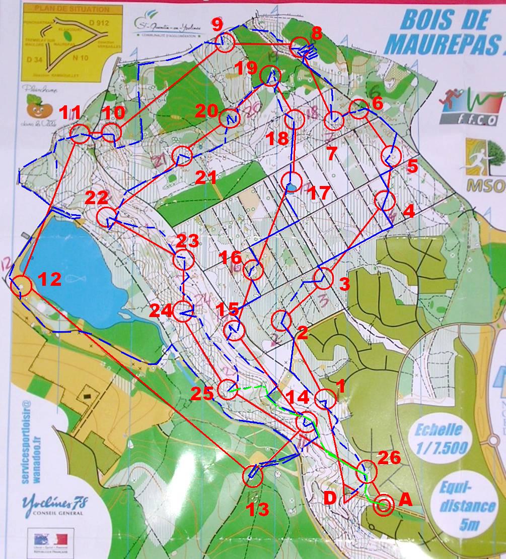 Comme chaque année, les associations Guyancourt Orientation 78 et Montigny Sports d'Orientation organisent le Trophée de Course d'Orientation de St Quentin en Yvelines tous les mercredi de juin Cela permet de faire quelques courses d'orientation de proximité. Cette année j'ai prévu de participer aux 4 courses, et de m'inscrire en priorité sur le circuit A (le plus long) Cette semaine, un circuit assez physique mais surtout très dense puisqu'il concentre pas moins de 26 balises sur une carte A4 au 1/7500ème ! (et encore, on utilise même pas toute la carte) |