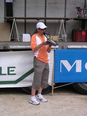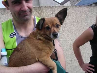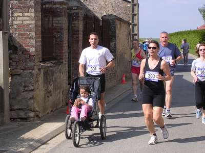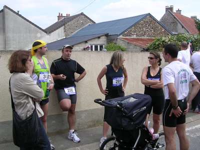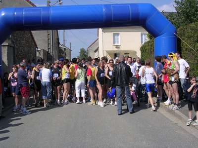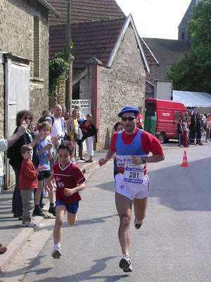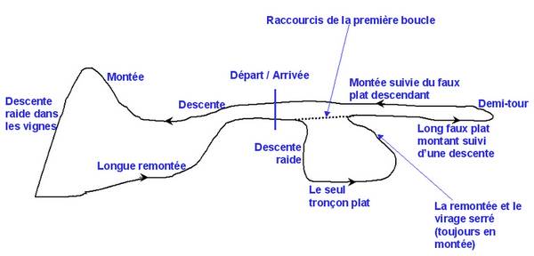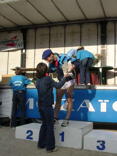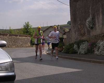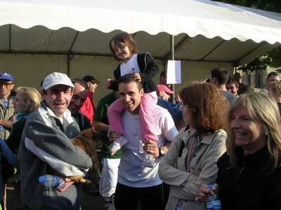 Bref vous l'aurez compris, on est en plein dans l'ambiance et en plus on ne se sent pas trop perdu ... L'après midi avance et c'est l'heure de la course populaire. Cécile et Taz étant inscrites sur la distance, Soul et Domi ont décidé de les accompagner, Soul poussant le vice jusqu’à faire la course avec Elisa dans la poussette ! L'Papy aussi va faire le doublé course populaire / course des as. Bref si je comprend bien ils vont tous bénéficier d'un échauffement tip-top, pendant que le Pirate, Patate et moi nous décidons de prendre l'option "spectateurs". La course est lancée, et tout de suite l'Papy fait des siennes en se plaçant sur les avant postes... Le plus drôle dans l'histoire, c'est qu'il va réussir à y rester (et même largement) jusqu'au bout, et que pour une fois il va tordre le cou à sa traditionnelle "place du c#n".. Il ne sera pas 4ème, ni même 3ème ou 2ème, mais il vas finir 1er au scratch !!! bravo ! Derrière, c'est Mylène (sa fille) qui va faire la même chose en junior, apportant un troisième podium à la Papy's team, et en plus 3 fois la plus haute marche ! Quelle famille ! Le reste du clan va finir la course, profitant ainsi de la chaleur qui commence à se faire sentir (c'est vrai qu'on avait un peu oublié à quoi ressemblait le soleil depuis quelques temps !). Cécile, Taz, Domi et Soul termineront toutes et tous profitant de l'occasion pour mettre leur premier dossard dans l'urne du tirage au sort (vous comprendrez plus tard) Retour en piste assez rapide avec la préparation de la course phare de cette journée : La course des As... Et des As il y en a... Ah non, je ne parle pas de nous (quoi que...) mais de quelques personnalités venues répondre également à l'invitation de Bruno. Soyons honnêtes. Je connais quelques semi et quelques marathon qui aimeraient bien avoir un plateau comme celui de Ste Gemme. Quand vous avez comme parrains et marraine les noms de Fetizon, Moros, Courton ou Bec ça le fait quand même un peu ! Quand en plus ils sont sur la course, on se dit qu'il va falloir s'accrocher pour faire un podium. Pour infos, Pascal et Héléna Fétizon, vont remporter la course chacun dans leur catégorie, Jean-Jacques Moros est ni plus ni moins que le nouveau champion de France de 100km (et terminera 3ème - quand je vous disais que le podium serait disputé), Brigitte vient de battre le record de France de 24h à Brives avec 235km (elle est au repos, et ça se comprend), mais son mari de Shadock (qui a battu son record perso également à Brives avec 210km) lui participera à la course, Bernard Courton étant quand à lui créditer d'un superbe chrono sur 100 bornes. Le plateau était composé d'une dizaine d'autres coureurs de très bon niveau et de... nous ! Pas grave, on est des durs de durs, et on va tous les pourrir quand même... Surtout que je suis au top sur 10km... J'en ai fait un il y a deux ans, et le précédent doit remonter à 2001 je crois ! L'heure approche. On se dirige vers le départ. Les élites sont du côté gauche de l'arche, on va donc se placer à l'opposé histoire de partir derrière le peloton et de ne pas les gêner devant ! Je me retrouve donc tranquillou derrière avec Domi, Soul, le Pirate et Patate (qui a confié p'tite patate à madame neutron - attention grôôôsseeee responsabilité) , seul le Papy se faufile pour se mettre en première ligne ! Quelques instants avant le départ on voit les champions traverser le peloton et venir se mettre juste devant nous !!! "- Heu vous faites quoi là ? Vous partez pas devant ? Sic ! On s'est gouré de sens ! On se retrouve au deuxième rang juste derrière pascal Fétizon et Jean Jacques Moros ! Le départ risque d'être chaud ! Ah oui, il faut quand même que je vous parle du parcours. Personnellement je m'attendais à un circuit tout plat avec éventuellement une petite côte, juste histoire de corser un peu les choses. Visiblement, Bruno à fait l'inverse. Il a mis des côtes partout et un tout petit bout de plat ! Pour faire simple, le circuit fait une sorte de 8 (qu'on fera 4 fois) et ça donne un léger faux plat montant court devant le départ, une descente raide sur la droite puis virage à gauche avec les 100m de plat de la course, remontée bien raide avant un virage en épingle à cheveux qui nous fait rejoindre un gros faux plat montant sur route (bon cette partie là on ne la fera que 3 fois car au départ on nous fait partir directement sur la route en faux plat. Merci Bruno) On continue la route qui d'un seul coup se met à bien descendre, et un peu plus loin, demi tour (serré) pour reprendre cette même route à l'envers et donc une belle grimpette, puis un faux plat descendant (ouf on souffle un peu). Là on passe sous l'arche, mais on a fait que la première boucle du 8 (soit la moitié du tour). Ensuite une descente dans le centre du village, puis une remontée (pour changer) avant de prendre à 90° sur la gauche et de descendre droit sur un sentier au milieu des vignes. Une fois en bas, encore un virage serré à gauche puis une longue montée qui continue jusqu'au passage sous l'arche. Fin du tour... Sauf qu'il y en a encore 3 autres à faire derrière ! Attention, prêt partez !... Mouarf, ça part vite de chez vite. Pas le temps de souffler et après 100m je suis déjà dans le rouge (et c'est pas fini). On attaque direct le faux plat sur la route puis la descente toujours sur route au premier tour jusqu'au demi tour. dur dur, j'ai rien vu venir pour le moment. Je suis avec Patate et déjà Soul, Domi et le Pirate ont pris un peu le large. j'essaie de gérer la remontée d'après le demi-tour, et je souffle un peu en attaquant le faux plat descendant. Passage dans le centre, encouragement du Speaker en chef et de nos petites familles, puis on attaque la remontée dans le village. pfff je vais pas tarder à exploser en vol moi... Le virage à gauche à 90° et la descente dans les vignes. Il faut faire attention car le sentier a 