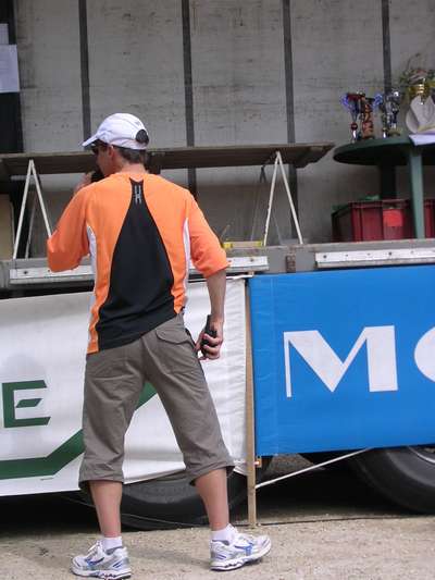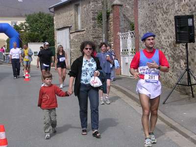 Je file aux inscription retirer mon dossard, et là les rencontres continuent puis que j'y retrouve Soul et que je fais connaissance de Cécile et d'Elisa sa petite dernière. Je demande à la dame de l'organisation mon dossard et elle me dit : "- c'est pour la course des as ? Le groupe est presque au complet. Le dernier membre du groupe prévu au programme arrivera peu de temps après en la personne du Pirate venu en célibataire (mais on comprendra pourquoi grâce aux photos prises pendant la soirée d'après course !) Les premières courses sont lancées à savoir celles des enfants... En les suivant un peu j'ai la surprise de voir que le village n'est pas tout à fait plat. En fait pour être totalement honnête , il n'y a pas un seul endroit plat. Je commence à me poser quelques questions, et le papy me dit que cette année ils ont modifié le parcours. On ne va pas tout au fond du vallon, mais on va juste faire des petites boucles dans le centre du village. Résultat, un enchaînement permanent de montée, descente, virage, faux plat, et accidentellement un tronçon de 100m de plat (celui là ils ont du trimer sec pour le trouver.) Je profite de la course enfant pour aller saluer notre hôte qui organise et anime ça d'une main de maître juste avant d’aller suivre de la première victoire du Papy's clan de cette journée avec l'arrivée loin en tête de Théotim (c’est bien comme ça que ça s’écrit ?). Je retrouve aussi un autre Bruno (Bordier) qui lui va gérer les course depuis son ordinateur (il faut bien faire les classements) Heu Bruno, le public, il est de l'autre côté !