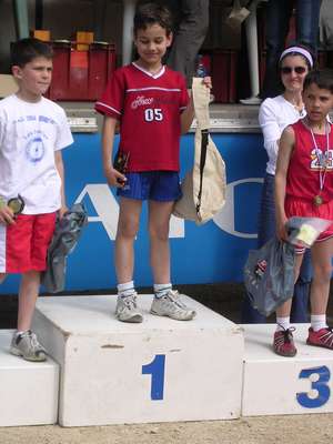 En général dans ce genre de course il y a plein de "GPAO"... et en tournant à un modeste 12km/h on a quand même pas mal de monde derrière. Là c'est franchement différent. Non seulement pour courir à 12km/h il va falloir se lever tôt vu le parcours, mais en plus à peine parti, on s'est retrouvé avec Patate dans les derniers... Bon pas grave on les remontera au 2ème ou 3ème tour ! Passage sous l'arche et premier tour de bouclé. On découvre alors la petite boucle évitée lors du départ. Un virage à droite à 90°, une descente raide, un virage à gauche à 90° le chemin plat empierré, un virage à gauche à 90° et la montée sur route avant le virage serré en côté vers la droite qui nous ramène sur la route. pendant la montée je ralenti un peu l'allure et Patate est obligé de m'attendre un peu. De toutes façons, à ce rythme là je risque fort de ne pas arriver au bout. On se lance dans la seconde des 4 boucles et après le demi tour, Patate se sentant bien part rechercher Domi et Soul ! J'en profite pour essayer de trouver mon allure. Enfin une à laquelle je puisse au moins respirer ! Au fil des kilomètres je m'adapte, mais le plus horrible c'est que je ne remonte absolument personne... Au contraire, je continue à me faire dépasser régulièrement ! Je profite du ravito au niveau de l'arrivée à chaque tour pour prendre un verre d'eau. Le soleil s'est caché au moment du départ et même si les conditions sont idéales, j'ai super soif ! A chaque boucle on croise les autres coureurs à 2 reprises ce qui permet de voir que Soul et Domi m'ont pris de l'avance. Dans le 3ème tour, je commence aussi à voir passer les avions (comprenez, ceux qui vont me mettre un tour !). L'objectif de Soul et de Domi de ne pas se faire doubler aura du mal à tenir vu le peu d'écart entre nous ! Pendant les deux derniers tours je met un point d'honneur à ne pas marcher dans les côtes... Et pourtant c'est pas l'envie qui me manque... Juste quelques mètres... NON ! pas question... Même si l'allure baisse un peu je ne ferai pas d'arrêt. Qu'on se le dise ! Finalement en grognant et en soufflant assez fort, je vais passer la ligne d'arrivée en 51'07 pour une distance estimée à 9,9km (au lieu des 9 annoncés initialement, mais on est pas à ça prêt). De toutes façons j'ai tout géré aux sensations, n'ayant aucun repère à cette allure et le parcours ne permettait d'essayer de faire une course régulière. Je n'ai donc jamais regardé le chrono pendant l'épreuve. Passage à l'arrivée, des sucres, de l'eau et je retrouve l'équipe qui me demande si ça va bien ? "- heu oui pourquoi ? Le temps de souffler, d'aller enfiler des vêtements secs et tout le monde se retrouve au car podium pour la remise des récompenses des deux courses. On a donc le droit à l'officialisation du triomphe Papyesque sur le 3 km... avec un prix remis par la marraine à savoir... Bibi !