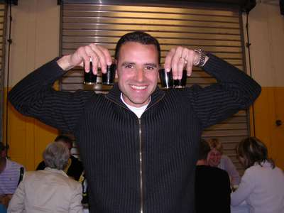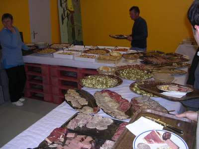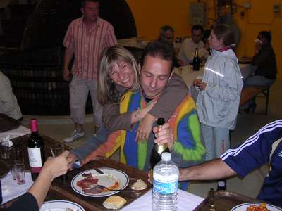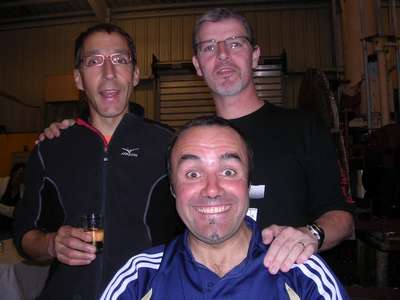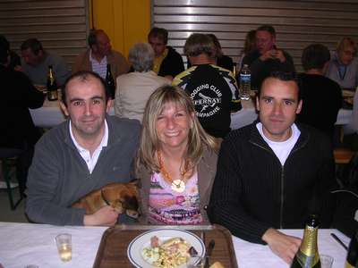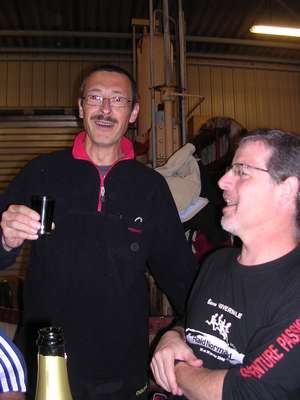 S'en suit le podium de la course des as, puis le moment important de Ste Gemme, la tombola. Soyons honnête, la tombola va durer beaucoup plus longtemps que la course elle même tellement il y a de lots à gagner. Et là, ceux qui ont fait le 3 et le 9 km ont un avantage énorme, car ils ont eu 2 dossards (un par course) ... Les lots s'enchaîne et après un début de remise sans grand succès pour notre petite équipe, la Soul team et la Domi team vont commencer à rafler les lots allants du seau à champagne au livre de collection en passant par une montre ou un tablier de cuisinier que Taz imagine immédiatement, porté par un Domi... version soubrette ;-) La papys family ne sera d'ailleurs pas en reste, en gagnant un... cendrier (ça c'est pour le papy) mais aussi un peu de boisson à bulles pour sa cadette... J’en profite aussi pour tenter de prendre quelques nouvelles des zanimos qui sont actuellement à la Cro Magnon. Après plusieurs tentatives (le réseau passe pas terrible à Ste Gemme) et quelques répondeurs, j’arrive à avoir des nouvelles fraîches de la part du Blueb et de la Souris… Je fais le relais auprès du Papy et du reste de l’équipe. Mais c'est pas tout. Il est plus de 20h30 (alors que la course à eu lieu à... 17h30) quand se termine la tombola avec la remise de kolossales bouteilles(géroboam) de bordeaux et de champagne,. Normalement on doit passer à l'étape suivante pour 21heures, (l'étape suivante étant l'AAB à la coopérative du village) mais avant ça on doit passer au gîte que nous partageons avec Soul, histoire de prendre au moins une petite douche. De toutes façons, Patricia nous dit que vu le léger retard pris, ça ne commencera pas avant 22h et qu'on a largement le temps de passer au gîte J'en profite au passage pour remercier Cédric, sa compagne et ses parents pour l'accueil qu'ils nous ont réservé. Donc passage rapide au gîte, douche et direction la coopérative de Ste Gemme. Là des tables ont été dressées autour des pressoirs Le buffet est en place, et franchement, il y a de quoi se rassasier… même après une épreuve aussi forte ! Sur les tables trônent une belle alternance de bouteilles de bordeaux et de bouteilles de Champagne à tel point qu’on ne sait pas dans quel sens les prendre (je veux dire vin puis champagne ou champagne puis vin… les bouteilles on sait comment les prendre elles) Petite surprise du chef, quelques cubis trônent sur une table dans le fond de la salle… mais c’est quoi donc que c’est ??? Oh ! du vien encore… Oui mais en cubi, c’est étrange… Heu ça veut dire quoi GPL écrit sur le premier ? GPL – Grand Puy Lacoste… Bref vous l’aurez compris, sous un faux air de vin de supermarché, notre cuisinier en chef (qui travaille aussi pour de grand châteaux) nous a apporté quelques échantillons ! ! ! Sluurrpppppp A partir de là ça va devenir difficile de tout raconter. D’abord parce qu’au fil des blidas (pour les incultes, les blidas sont les petits verres traditionnellement utilisés pour goûter le champagne, et toc !), les choses vont s’emmêler au point de ne plus faire la différence entre le GPL et un autre Haut-Médoc (enfin, ça c’est ce qu’on raconté les autres !!!).