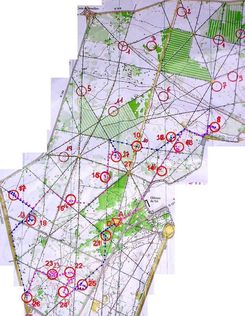 Principe : Course au score en 3 étapes. - Le mercredi 8 novembre, durée d'une heure maximum, à Verrieres le Buisson (91)- Le mercredi 15 novembre, durée d'une heure et demie maximum, à St Germain en Laye (78) - Le mercredi 22 novembre, durée de deux heures maximum, à Meudon (92) Classement par étape : - Nombre de balises poinçonnées puis temps de course. ATTENTION: nous multiplions par 2 chaques minutes de retard (par exemple sur la course d'une heure, le coureur arrive au bout d' 1 h 02, il aura donc un temps compensé de 1h04). Une balise est retirée toutes les cinq minutes du temps compensé (par exemple, le coureur fait 1h03, le temps compensé est de 1h06 et il a donc une balise de retirée) Vous pouvez retrouver la définition des postes et la carte |