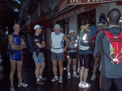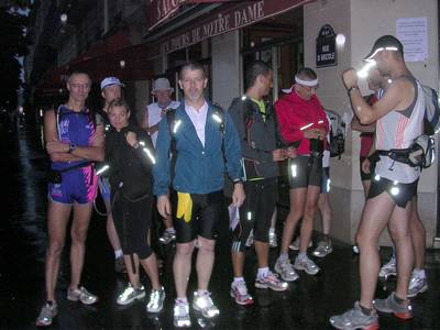 Alors côté pratique ce sera un samedi matin. Pourquoi le samedi ? Et bien parce que le samedi, paris est assez vivant... on traverse des marchés, des zones commerçantes, et si il est agréable de courir la nuit dans Paris sans qu'il y ait trop de monde, j'aime aussi quand il y a du monde, surtout si ce sont des zones de vie ! Ensuite, de nombreux passages où je veux vous emmener sont privés ou semis privés. beaucoup sont fermés dimanche... Donc les chances qu'ils soient ouverts sont plus importantes le samedi ! Pour l'heure ce sera un départ avec le petit jour. Vue la distance, cela devrait nous permettre de finir le tour entre 12 et 14h. Ceux qui voudront rentrer seront libre de bonne heure et pour les autres, rien n'empêchera de croquer un morceau en terrasse pour récupérer Le départ est fixé à 06h00 sur le parvis de Notre-Dame On va aussi passer dans quelques parcs et jardins de la ville de paris. Et là aussi, il y a des horaires d'accès. Si on passe trop tôt ce sera fermé. D'ailleurs au début ça devait s'appeler UTRPPP, le P supplémentaire correspondant aux "Parcs"... Mais Manu (le Sanglier) ayant derrière le groin l'idée de faire le tour des Parcs et des zones vertes de Paname, j'ai enlevé une bonne partie de ces passages (rassurez vous j'en ai gardé quelques uns que j'aime bien , et toc !) Alors c'est quoi et ça se passe comment un OFF ? Pour la logistique, l'UTRPP étant un OFF... Donc chacun se démerde comme il peut (ou comme il veut) ! Pas de ravito officiel. Chacun emporte ce qu'il lui faut pour tenir en autonomie pendant la sortie. Bon OK, ce sera une autonomie toute relative puisque les multiples brasseries qui vont croiser notre route nous permettront toujours de faire une petite pause autour d'un café ou d'une mousse en cas de nécessité ! Prévoyez donc un peu de monnaie ! Paris, Paname, Pantruche, Lutèce, Ville Lumière, Ceux qui ne connaissent pas Paris ont souvent en tête l'image des grandes avenues et de la place de la Concorde embouteillées... En y ajoutant une couche de pollution, de stress, de gens qui courent pour aller au boulot, pour en revenir et pour y retourner, c'est vrai que cela offre de Paris une vision qui n'est pas particulièrement attirante. Et pourtant celles et ceux qui connaissent la cité savent qu'il existe une autre Paris... Une ville plus discrète, plus confidentielle, ne s'ouvrant qu’à celles et ceux qui prennent le temps de pousser les portes cochères et les grilles des galeries ou des passages. Samedi 8 Juillet. 06h00 . Deux ombres blanches sortent d'un parking situé sous le parvis de Notre Dame au cœur de l'île de la Cité. C'est là exactement que se trouve le point zéro des routes de France, point de repère situé devant Notre-Dame de Paris et matérialisé sur une dalle.C'est aussi là que se sont donné rendez-vous une petite quinzaine de coureurs, venus de Paris, de banlieue, de province et même de Belgique pour un UTRPP (Ultra Tour des Ruelles et des Pavés de Paris) édition 1. Quelques mois de repérages ont permis de sillonner environ 1/3 de la superficie de la capitale. Et quand je dis sillonner, c'est aller dans chacune des rues pour y noter les point intéressants, ou insolites. Pas moins de 250 "spots" ont ainsi été identifiés principalement dans les centre et le nord-est de la ville. L'objectif est maintenant de tracer un circuit exploitant au mieux ces points en évitant les grandes avenues et le bitume. Un premier essai incluant tous les points porte le tracé à 77km... Trop long par rapport à l'objectif annoncé d'environ 45 km. Une seconde passe permet de supprimer quelques grosses options (Les Buttes-Chaumont, la Villette, le jardin du Luxembourg ou une partie du XIIème arrondissement) et ramène le parcours à 53km. C’est mieux. Les dernières retouches se feront pendant la sortie en fonction de l’état et des envies des participants. Alors que toute la semaine précédente a été l’objet de fortes chaleurs, la météo a décidé de nous éviter tous risque de déshydratation et nous fournissant nuages et pluie. Seule la température est de saison. Rencontre des participants. Certains se connaissent déjà mais pas tous ? Encore une fois la magie parisienne va jouer en permettant le rapprochement de coureurs venus de forums différents. Qu’ils soient venus ici grâce à Ultrafondus, Courir Le Monde ou CourseàPied.net, n’est pas important en soi, mais cela reste une petite satisfaction de permettre ce brassage des communautés (c’est un terme à la mode) de coureurs à pied. |