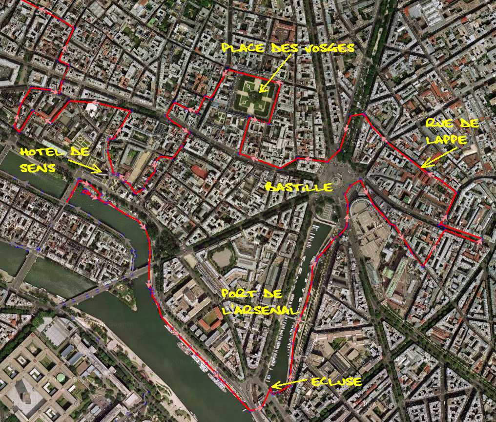 Le XIIème arrondissement va nous offrir des jolis Cours privés comme le Cours de l’étoile d’or ou le Cours de l’ours et quelques ruelles comme le passage du Chantier. Ensuite ce sera la rue le Lappe et ses resto dancing. Déserte à cette heure-ci, elle aurait été infranchissable en fin de soirée. On coupe le Bd Richard Lenoir pour retourner dans le 4ème. Un tour sous les arcades de la Place des Vosges nous permet ensuite de traverser le Village St Paul, petit labyrinthe de cours intérieures où sont installés brocanteurs et antiquaires. Les points particuliers se succèdent avec l’Hotel de Sens, les vieilles plaques de rues gravées dans la pierre au niveau de la Rue du Prévot