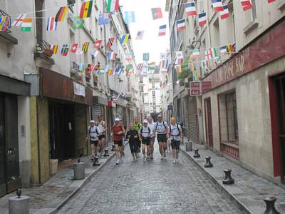 où une des plus anciennes maisons de Paris (les historiens ne sont pas tous d’accord) à l’angle de la Rue Cloche Perce. Régulièrement j’ausculte le groupe pour voir si tout se passe bien. Marc m’a demandé quelques jours avant la course si sa fille, Anne, pouvait venir nous accompagner une heure ou deux. Elle ne coure pas beaucoup, et sa compétition la plus longue reste la Parisienne avec ses 6km (oui, oui, vous avez bien lu !). C’est là aussi un des atouts de cette sortie. Dans Paris il est toujours possible de couper ou de stopper. On est jamais loin d’une station de métro (moins de 400m de n’importe quel point de la capitale). Pour le moment elle tient bon, et notre rythme peu soutenu ponctué de pauses fréquentes lui permet de rester dans le groupe. Les petits bouts de quartier s’enchaînes… ( voir la carte n°4) Beaubourg avec le superbe passage Molière, Art et Métiers avec le passage des Gravilliers, puis le quartier commerçant de la Rue Montorgueil où le marché est en train de se mettre en place. D’ici une heure la rue ne sera probablement plus traversable !D’ailleurs pour y arriver nous allons traverser le passage de l’ancre, étroit et fleuri, qui ne se découvre qu’après avoir poussé une porte cochère … Si on ne sait pas qu’il est là, on peut toujours le chercher