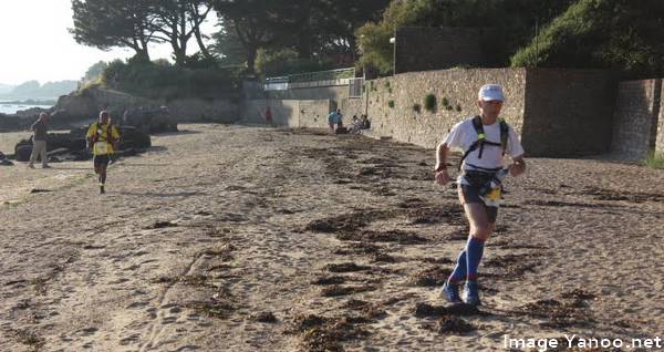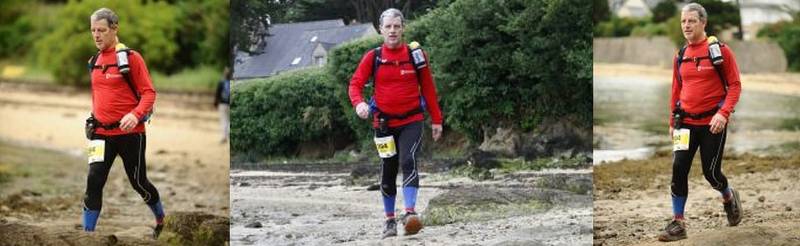 Sur cette partie, à un moment alors qu'on longe la côte, le sentier s'arrête et passe sur la plage au pied d'un mur. Sauf que là c'est marée haute et qu'il faut faire 300m dans la mer avec de l'eau à mi-mollets. Ce n'est pas tellement le fait d'avoir les pieds mouillés qui va me déranger, après tout il ne nous reste que 24km, non c'est surtout le fait qu'en marchant dans l'eau cela remue le sable qui du coup rentre dans les chaussures, et le sable breton ce n'est pas le sable du Sahara. Ici il est un peu gros le sable... Du coup en fin de section je suis obligé de faire une opération rincage des chaussures et des pieds pour pouvoir repartir les pieds propres (mais pas secs).