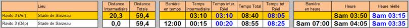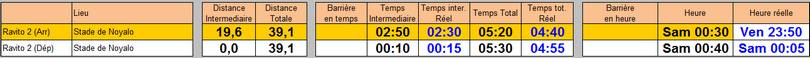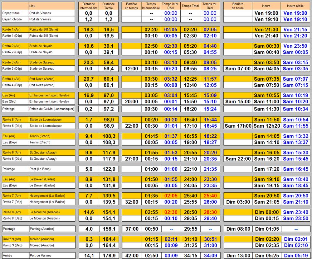 Je ne suis pas reparti de la feuille de route proposée sur le site de la course car elle calcule les temps avec une vitesse moyenne linéaire (la même sur toute la course) ce qui n'est absolument pas mon cas en réel. J'ai donc reconstruit une grille sur la base de l'itinéraire en identifiant les arrivées et les départs de chaque ravito, ainsi que des points particuliers (pointages, point d'eau,...)