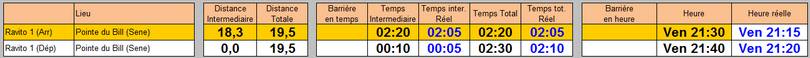 Pour la seconde fois, je réalise pratiquement le temps prévu (à 2mn près) alors que la nuit a quand même tendance à ralentir l'allure, parfois sans qu'on s'en rende compte.