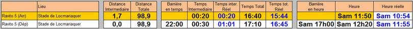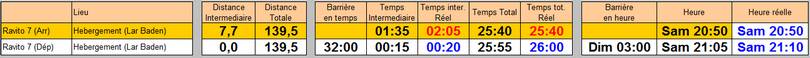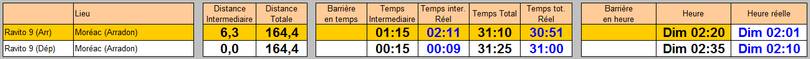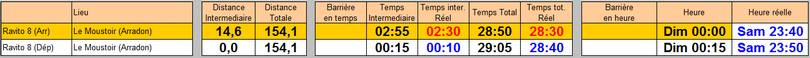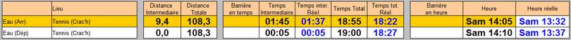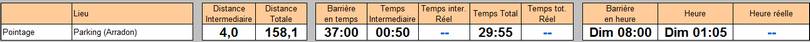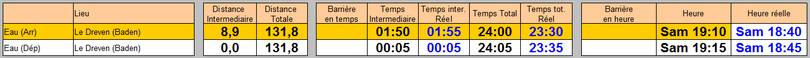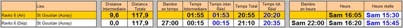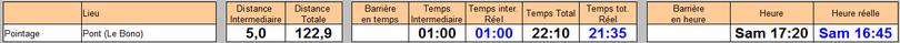 Si je prends le total estimé sur le pointage + cette dernière section (pour éliminer le mauvais positionnement du pointage), je fais 2h11 pour un total prévu de 2h05. Les coups de fatigue et mes soucis de ventre étant toujours là pour me faire consommer quelques minutes supplémentaires.